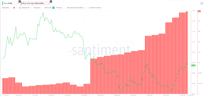 Seperti yang terlihat di bawah ini, usia koin rata-rata atau Mean Coin Age ARB telah menunjukkan tren naik sejak harga turun di bawah US$1 pada tanggal 23 Agustus. Sejak saat itu, usia koin rata-rata di jaringan Arbitrum telah meningkat sebesar 105% hingga mencapai 354 pada 1 November.