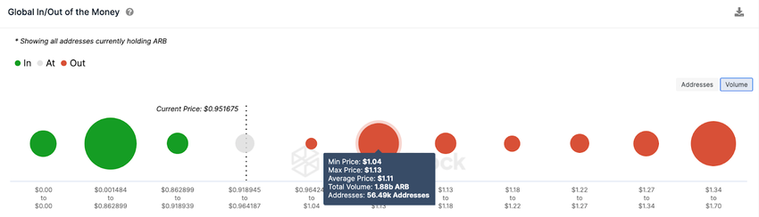Data Global In/Out of the Money, yang merupakan representasi on-chain dari tren pembelian historis holder ARB saat ini, juga menegaskan prediksi ini. Data tersebut menunjukkan bahwa resistance US$1 adalah hambatan terbesar di atas harga ARB saat ini.
