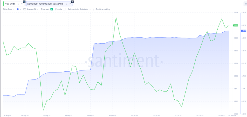 Dengan harga pasar saat ini sebesar US$0,95, akumulasi 20 juta ARB oleh whale dalam seminggu terakhir bernilai sekitar US$19 juta. Selain itu, mengingat betapa berpengaruhnya whale dalam ekosistem blockchain, gelombang akumulasi yang besar ini dapat meningkatkan kepercayaan diri di kalangan investor ritel strategis.