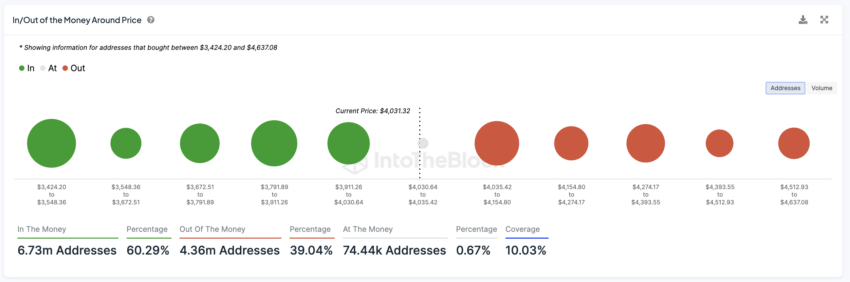 Saat ini, harga ETH tercatat masih 17% di bawah rekor tertingginya sepanjang masa (all-time high/ATH), yaitu US$4.867,17, yang tercapai pada 10 November 2021. Area harga antara US$3.790 sampai US$3.910 bisa bertindak sebagai zona support, di mana harganya berpotensi stabil. Ini akibat adanya konsentrasi holder yang posisi investasinya masih dalam kondisi profit.