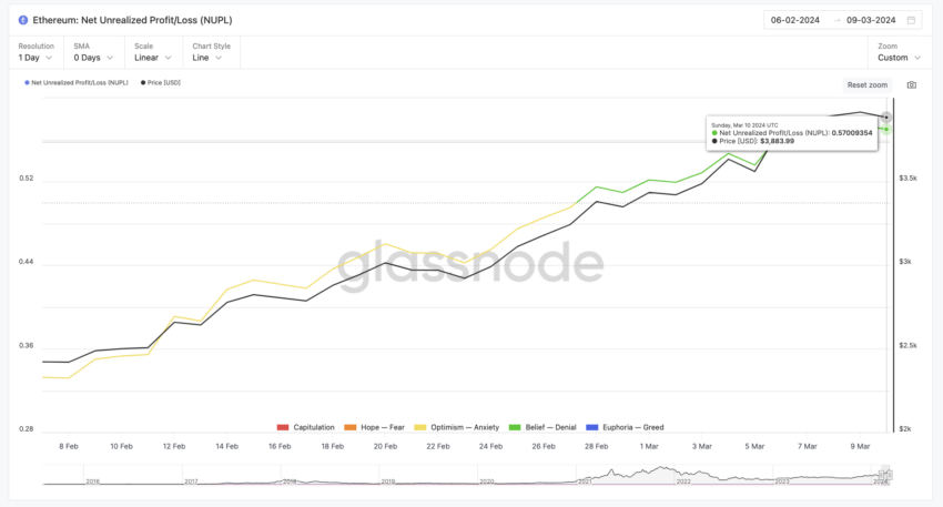 Antara tanggal 27 Februari sampai 28 Februari, indikator Keuntungan/Kerugian yang Belum Terealisasi Bersih atau Net Unrealized Profit/Loss (NUPL) ETH bergeser dari fase ‘Optimisme – Kecemasan’ atau ‘Optimism – Anxiety‘ ke level ‘Keyakinan – Penyangkalan’ atau ‘Belief – Denial‘. Perubahan ini menandakan bahwa mayoritas holder ETH sekarang berada di zona profit. Hal ini biasanya merupakan indikator bull market yang tengah mendapatkan momentum, di mana investor mempertahankan kepercayaan yang kuat pada aset mereka tanpa antusiasme yang berlebihan.