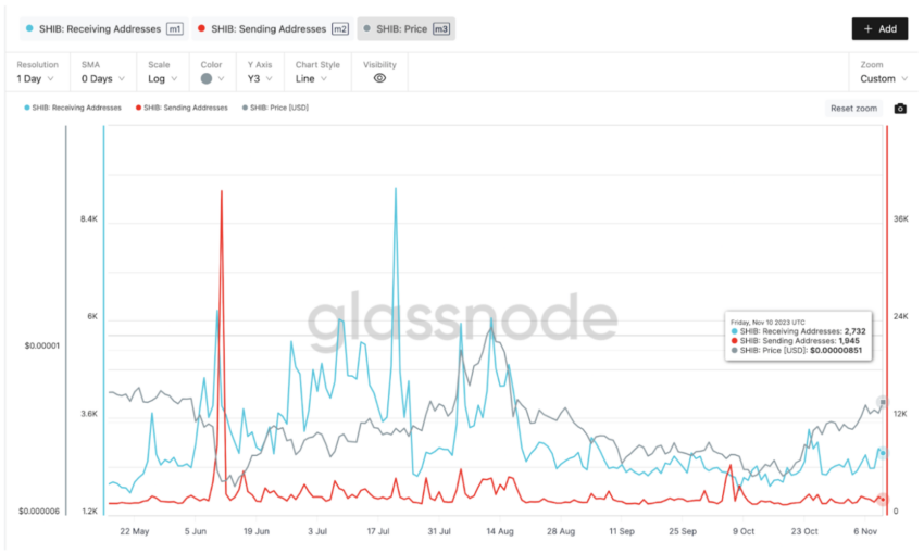 Menurut Glassnode, Shiba Inu mencatat 2.732 Receiving Addresses (Alamat Penerima) pada hari Jumat, 10 November, yang jauh melebihi jumlah 1.945 Sending Addresses (Alamat Pengirim). Namun, yang lebih penting lagi, jika dilihat lebih dekat, alamat-alamat yang membeli SHIB telah secara konsisten melampaui jumlah alamat yang menjual meme coin ini dalam 35 hari terakhir.
