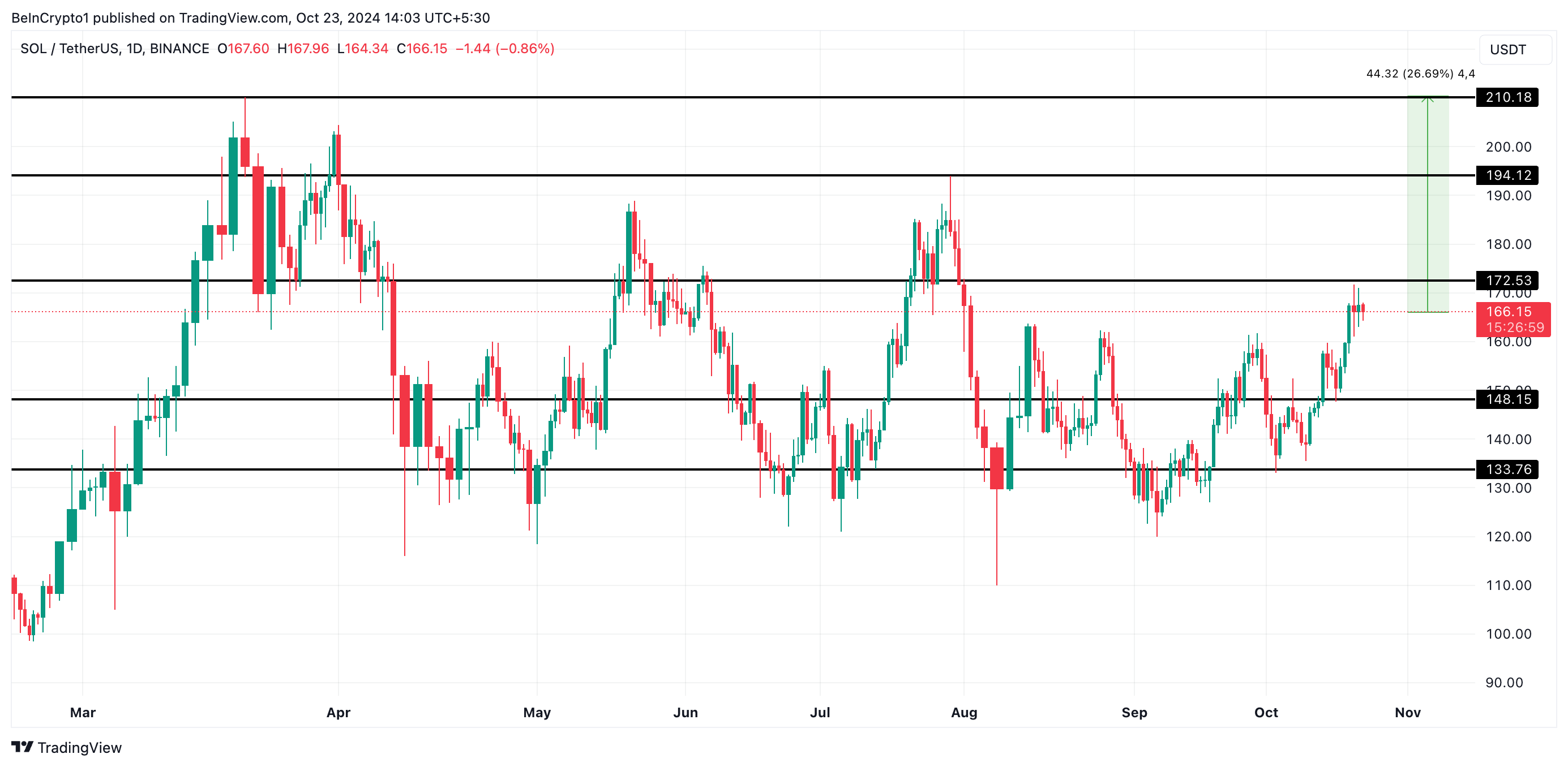 Jika Solana terus mengukir lonjakan aktivitas jaringan serta menambah permintaan untuk SOL, harga token ini—saat ini bertengger di angka US$166,15—berpotensi menembus level resistance di US$172,53.