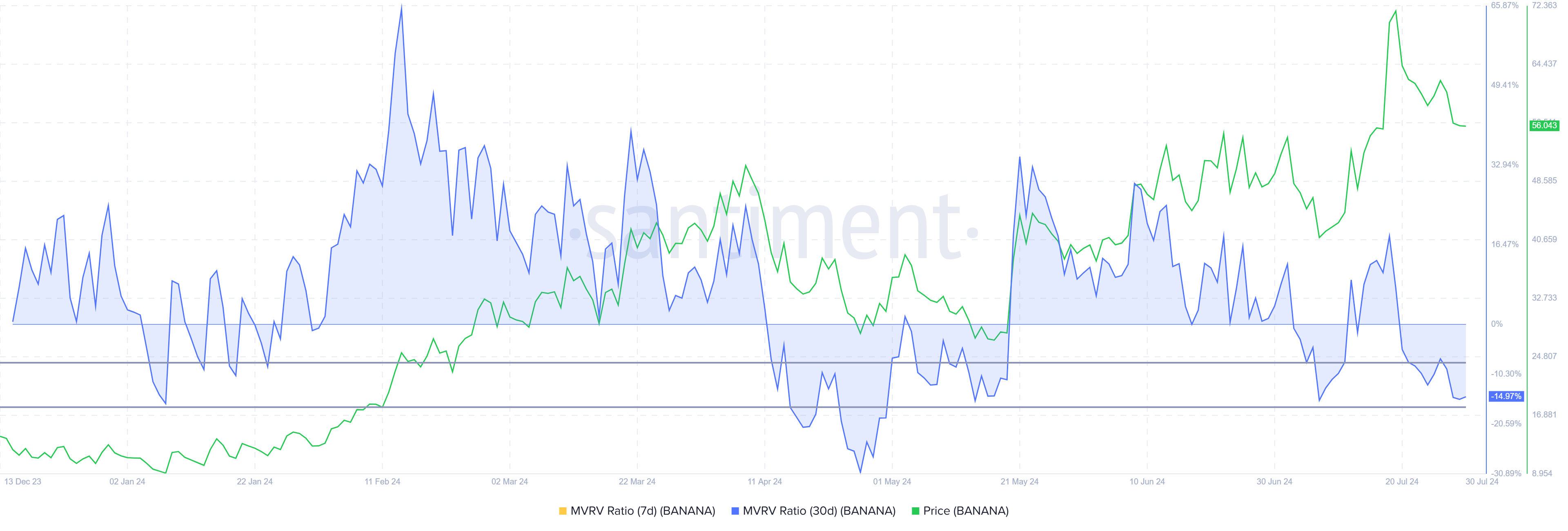 Rasio MVRV sendiri berguna menilai keuntungan dan kerugian investor. Saat ini, MVRV 30 hari BANANA berada di -15%, menunjukkan adanya kerugian dan sekaligus munculnya peluang tekanan beli. Secara historis, MVRV di kisaran -7% hingga -17% biasanya menandakan awal reli, melabeli kisaran tersebut sebagai zona peluang akumulasi alias beli.