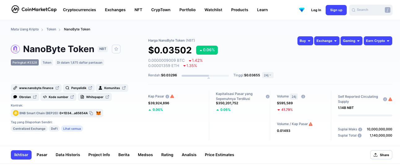 Berdasarkan pantauan pada saat berita ini ditulis, NBT kini menempati peringkat 3.328 dari 9.562 aset kripto yang terdaftar di CoinMarketCap. Jumlah fully diluted market cap NBT sekitar US$350,2 juta.
