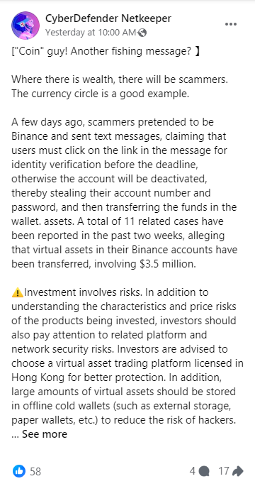 Pihak Kepolisian Hong Kong, melalui unit CyberDefender, mengungkapkan bahwa dalam dua pekan terakhir, 11 investor melaporkan adanya pencurian mata uang kripto senilai total HK$3,5 juta atau sekitar US$447,47 ribu dari akun Binance miliknya.