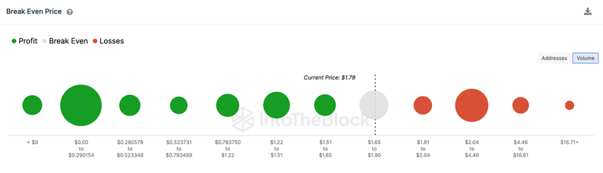 Menurut data distribusi Break-Even Price dari IntoTheBlock, para bear RNDR kemungkinan akan mendorong harganya untuk turun ke level US$1,58. Saat ini, sekitar 1.860 alamat yang membeli 65 juta RNDR diprediksi bisa memberikan support di zona break-even US$1,65.