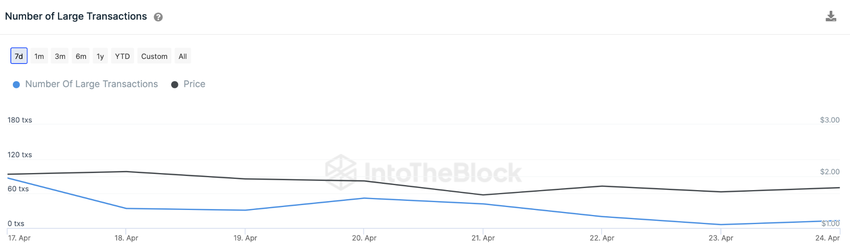 Sementara itu, grafik dari IntoTheBlock di bawah ini menunjukkan penurunan yang stabil dalam jumlah Transaksi Besar senilai US$100.000 atau lebih yang melibatkan RNDR. Setelah mencapai titik tertingginya baru-baru ini dengan 87 transaksi pada tanggal 17 April, jumlah transaksi besar yang melibatkan RNDR telah turun signifikan hingga menyisakan total 13 transaksi saja pada akhir 24 April.