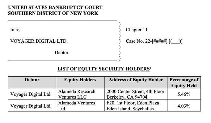 Penyerahan sejumlah saham ini membuat kepemilikan Alameda Research atas saham Voyager menjadi 9,49%, yang dapat dilihat pada halaman ke-7 dalam dokumen Chapter 11 bankruptcy Voyager Digital Ltd.