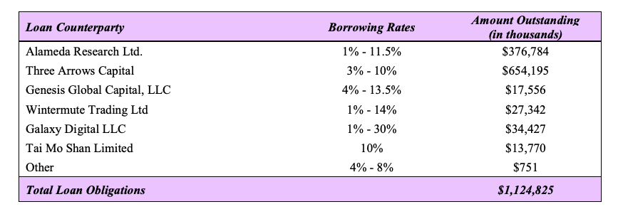 Sebuah tabel di halaman ke-13 dalam dokumen Chapter 11 bankruptcy dari Voyager Digital Holdings Inc, menunjukkan bahwa Alameda Research berutang kepada Voyager senilai US$376,78 juta dengan suku bunga pinjaman 1% hingga 11,5%.