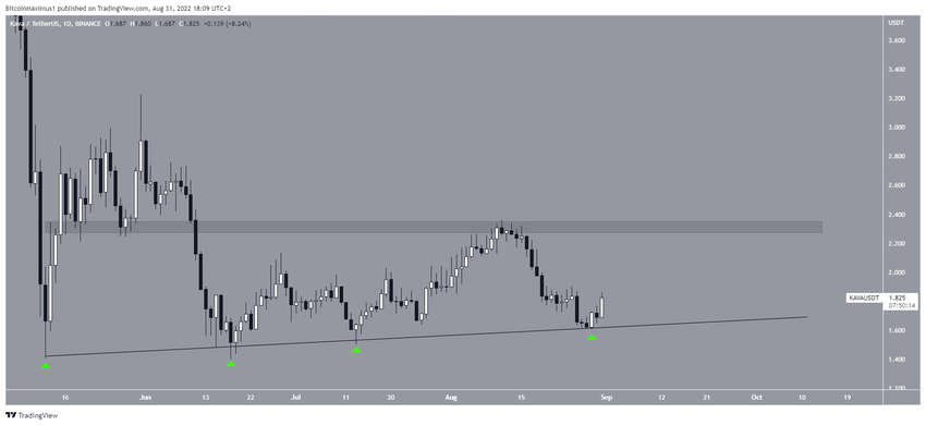Sejak tanggal 12 Mei, KAVA sendiri telah bergerak di garis ascending support. Sejauh ini, aset tersebut telah memantul di atas garis itu sebanyak empat kali (ikon hijau). Pantulan yang terakhir terjadi pada tanggal 29 Agustus. Tidak hanya itu, KAVA juga telah berhasil membentuk candlestick bullish yang besar pada tanggal 31 Agustus. Jika pergerakan ke atas ini terus berlanjut, maka area resisten terdekat akan berada di area US$2,30.