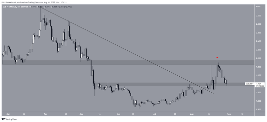 EOS memiliki native token dengan nama yang sana. Saat ini, EOS memiliki pasokan yang beredar sebesar 999.350.058. Harga EOS sendiri telah sukses menembus garis descending resistance tepatnya pada tanggal 11 Agustus. Setelah itu, EOS berhasil mencapai level tertingginya di titik US$1,94 tepatnya pada tanggal 22 Agustus. Namun, harganya terus menurun sejak saat itu. Akhirnya, EOS telah kembali ke area support horizontal untuk kesekian kalinya, dan berada di level US$1,40. Dengan demikian, EOS sekarang diperdagangkan pada kisaran harga antara US$1,40 dan US$1,95.