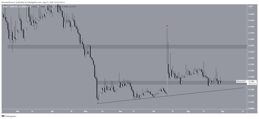 Selain itu, BEAM juga telah mengalami kenaikan di sepanjang garis ascending support sejak tanggal 12 Mei lalu. Kemudian, selama BEAM menyusuri garis ini, BEAM sempat melesat tajam pada tanggal 13 Juli, yang membuatnya berhasil mencetak titik tertinggi di level US$0,33 pada hari yang sama.