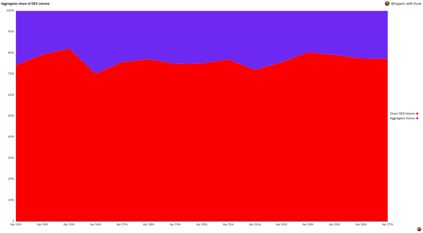Namun, data Dune Analytics menunjukkan bahwa volume perdagangan yang dilakukan melalui aggregator DEX kurang dari 30% dibandingkan dengan volume transaksi melalui DEX secara langsung.