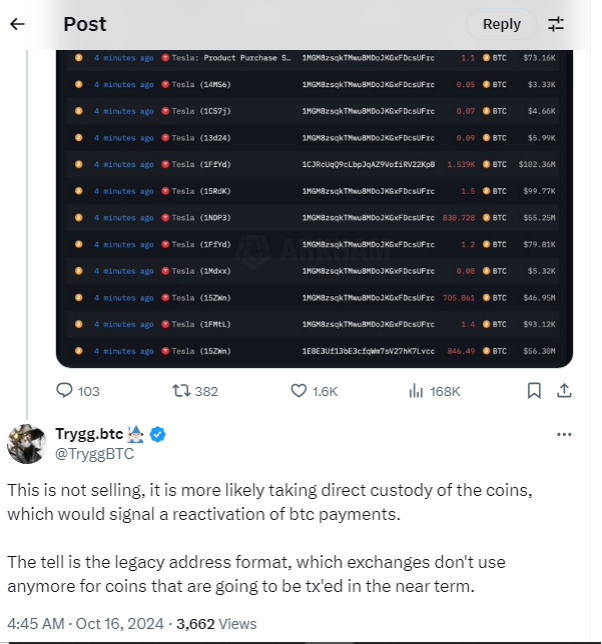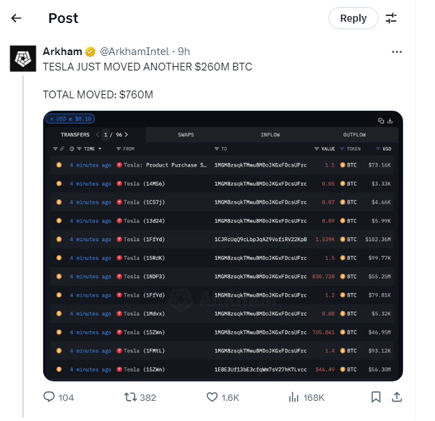 Berdasarkan data Arkham Intelligence, secara total, Tesla memindahkan sekitar 11.500 BTC dari Coinbase ke beberapa wallet. Belum diketahui apa motif yang terjadi di balik kejadian ini. Tetapi salah satu anggota komunitas menganggap bahwa aksi tersebut bukan bertujuan untuk penjualan aset.
