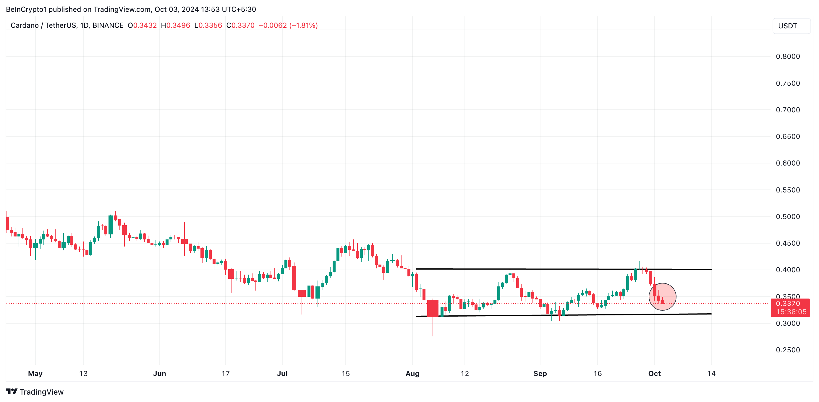 Terlepas dari kemajuan ini, harga Cardano belum menunjukkan dampak positif. Altcoin ini diperdagangkan seharga US$0,34, atau sudah turun 11% sejak 1 Oktober. Pada grafik harian, Cardano terpantau masih bertengger di dalam saluran horizontal. Harganya berulang kali menghadapi tekanan jual yang kokoh di level resistance US$0,40 meskipun ada upaya untuk breakout.