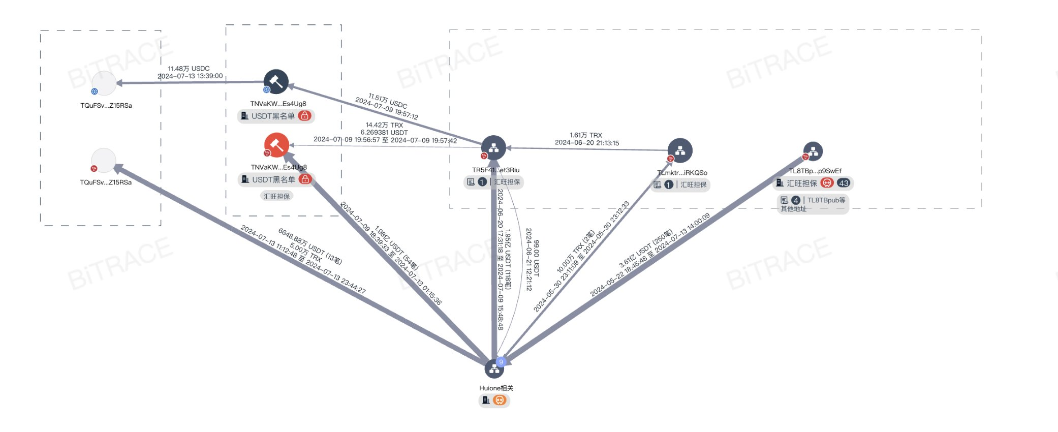 Perusahaan keamanan blockchain Bitrace melaporkan, wallet “TNVaKW” yang menyimpan token USDT beku tersebut terkait dengan bisnis jaminan Huione Group Kamboja. Crypto wallet ini dibekukan hanya berselang seminggu pasca diaktifkan pada 9 Juli 2024.
