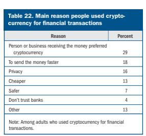 Namun demikian, harus diakui bahwa banyak pihak menganggap aset kripto memiliki keunggulan untuk transfer dana. Sebanyak 18% orang yang menggunakan kripto untuk transaksi keuangan mengatakan bahwa mata uang virtual lebih cepat untuk pengiriman uang.