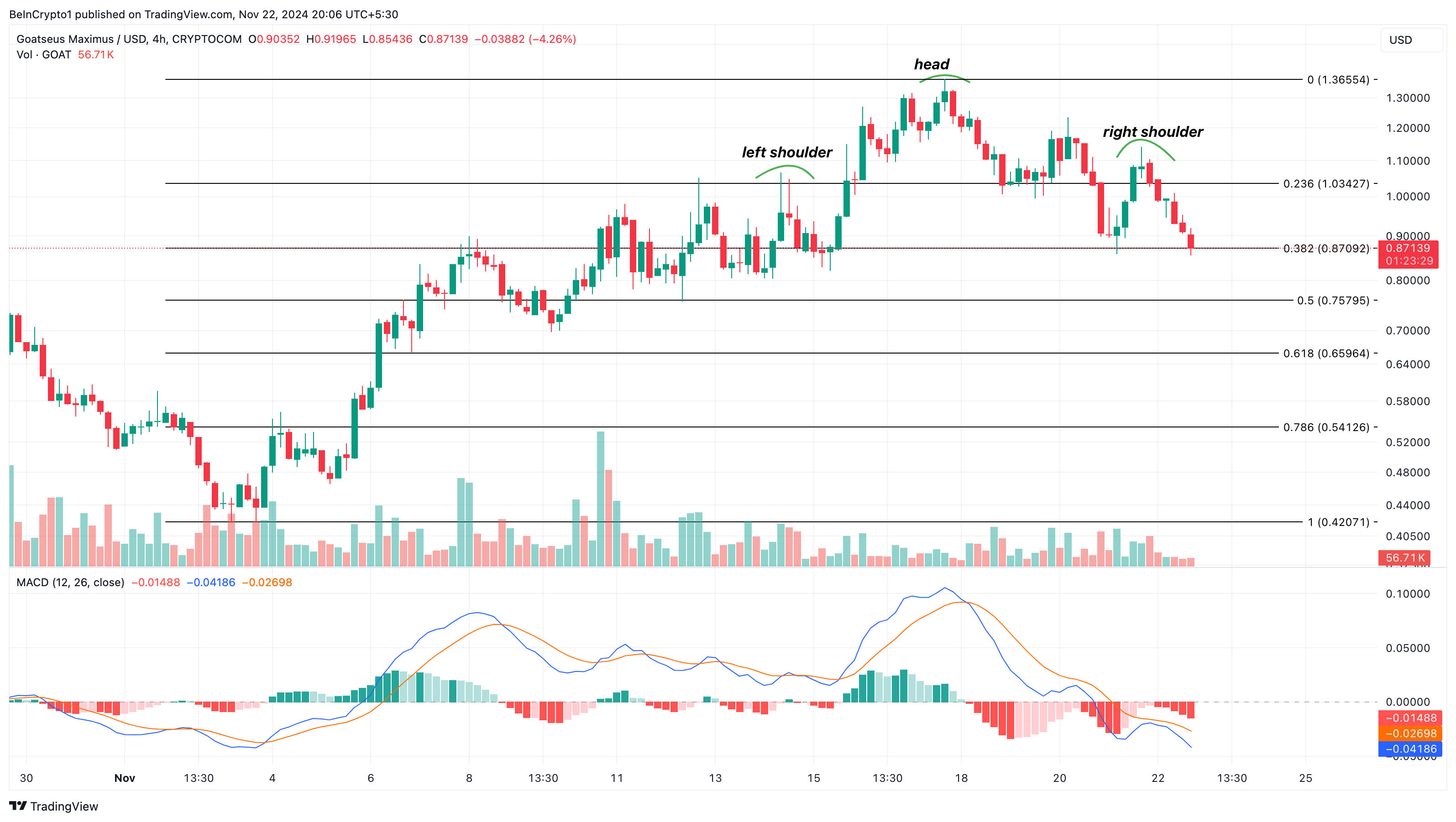 Menambah sentimen bearish, grafik 4 jam GOAT menunjukkan pola head and shoulders, yang merupakan indikator klasik dari reversal tren bullish menjadi bearish. Formasi ini mengindikasikan bahwa meme coin ini berisiko menjalani aksi turun lebih lanjut.