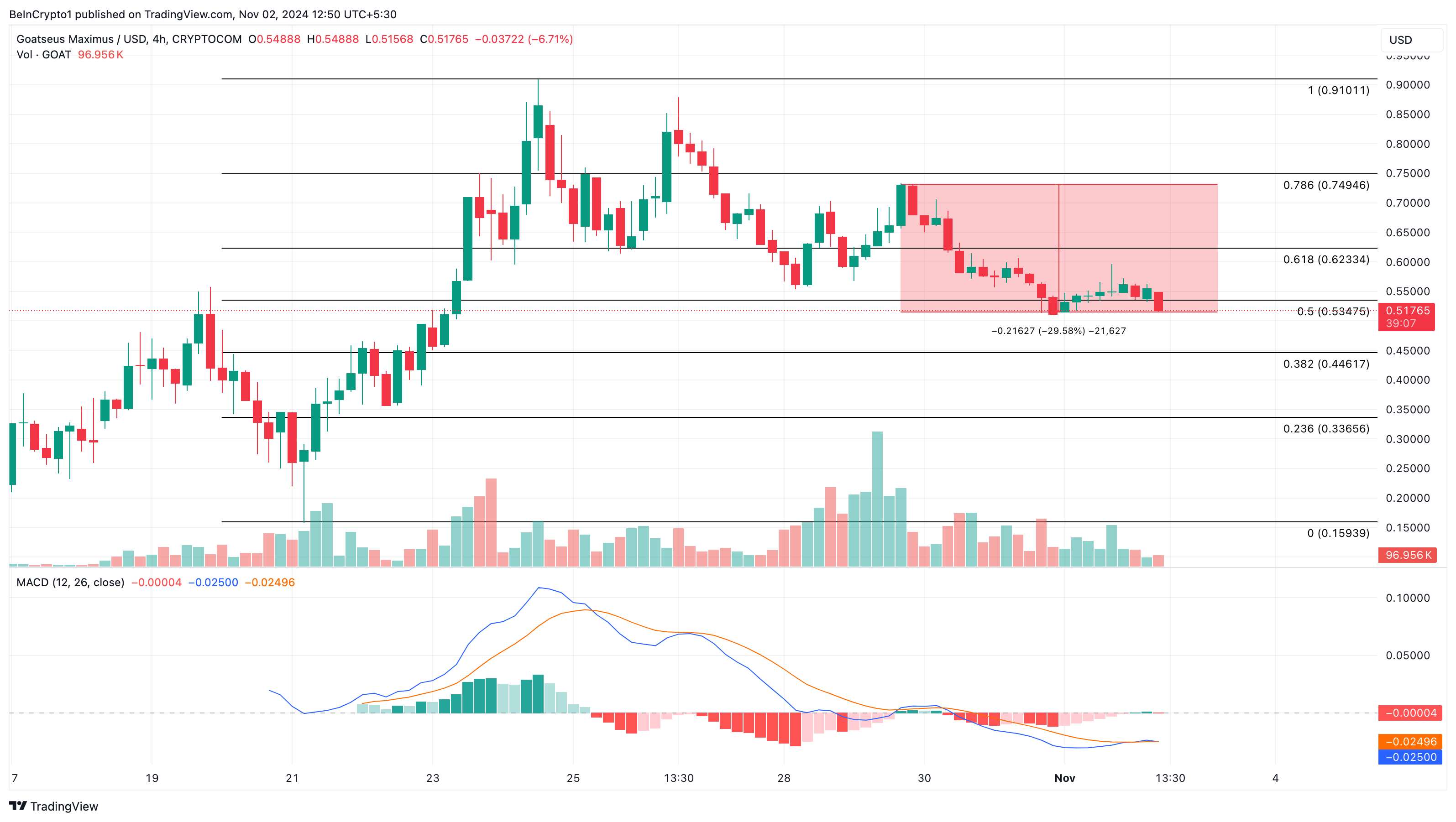 Namun, saat ini, harga GOAT telah ambruk hampir 30% sejak awal minggu. Pada grafik 4 jam, indikator Moving Average Convergence Divergence (MACD), yang mengukur momentum, telah memasuki area negatif.
