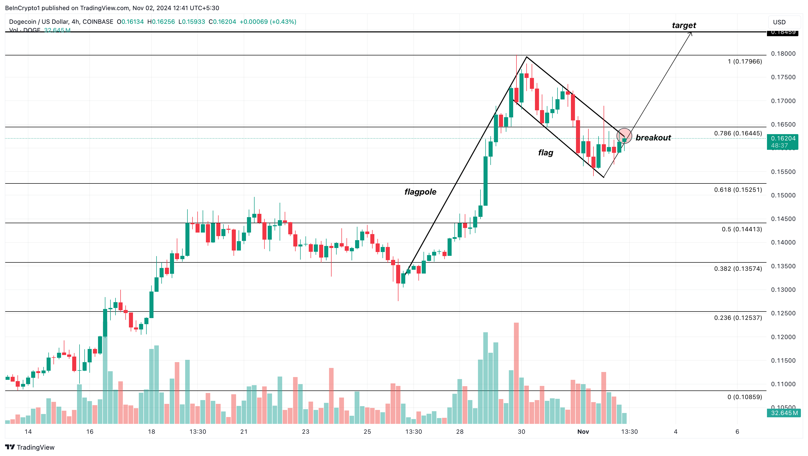Jika DOGE berhasil menembus fase konsolidasi (flag) dan konfirmasi berhasil, meme coin ini bisa naik ke US$0,18. Dalam skenario yang sangat bullish, Dogecoin bahkan dapat mencapai US$0,20.