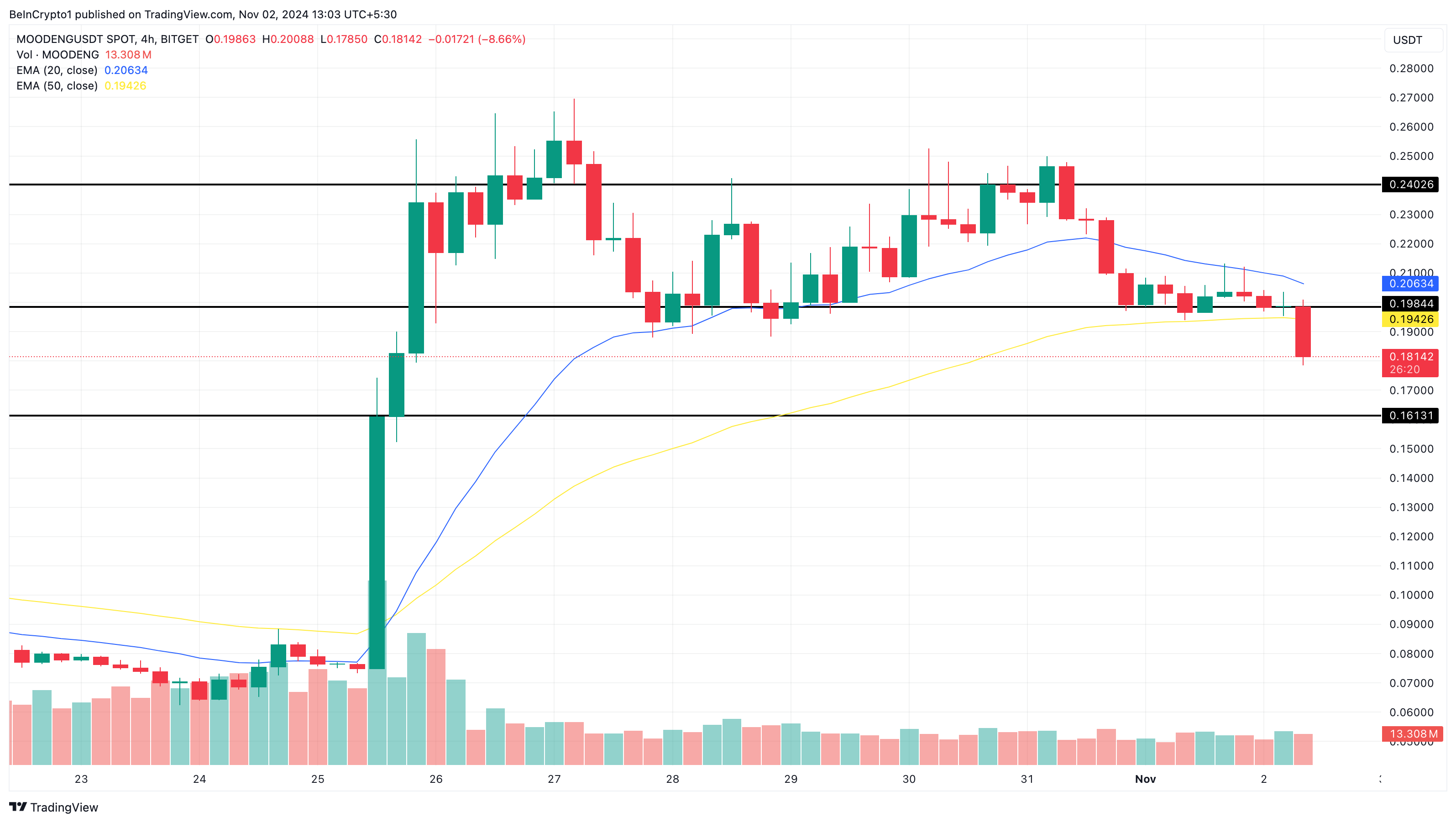 Tren turun ini kemungkinan buntut dari pergeseran fokus di pasar meme coin, di mana para trader memindahkan likuiditas dari MOODENG ke token lain yang tengah naik daun. Akibatnya, harga MOODENG pun tergelincir ke bawah Exponential Moving Average (EMA) periode 20 dan 50.