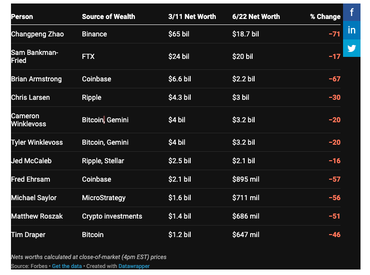 Bahkan, ada 4 dari 11 orang yang harus kehilangan status miliarder bila dibandingkan antara nilai kekayaan bersih mereka pada 11 Maret 2022 dan 22 Juni 2022. Orang-orang yang berada dalam daftar ini termasuk: Tim Draper dari US$1,2 miliar menjadi US$647 juta (turun 46%); hingga Michael Saylor dari US$1,6 miliar menjadi US$711 juta (turun 56%).