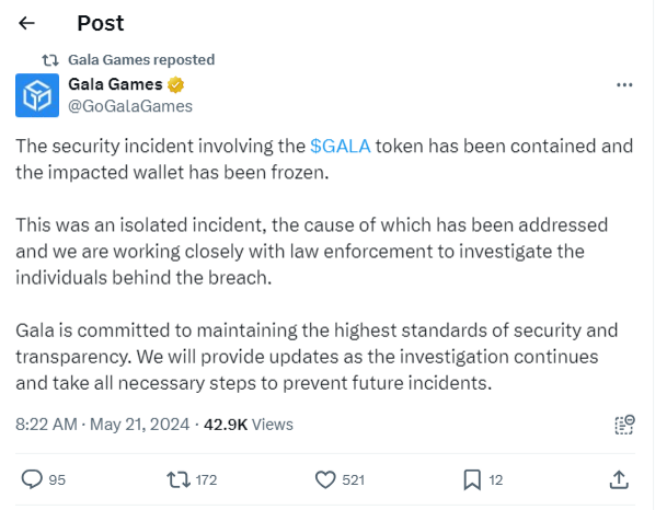 Tim pengembang Gala Games ikut turun ke X (sebelumnya Twitter) dan menjelaskan bahwa peristiwa tersebut sudah bisa diatasi dan perusahaan telah membekukan wallet yang diduga terkena dampak.