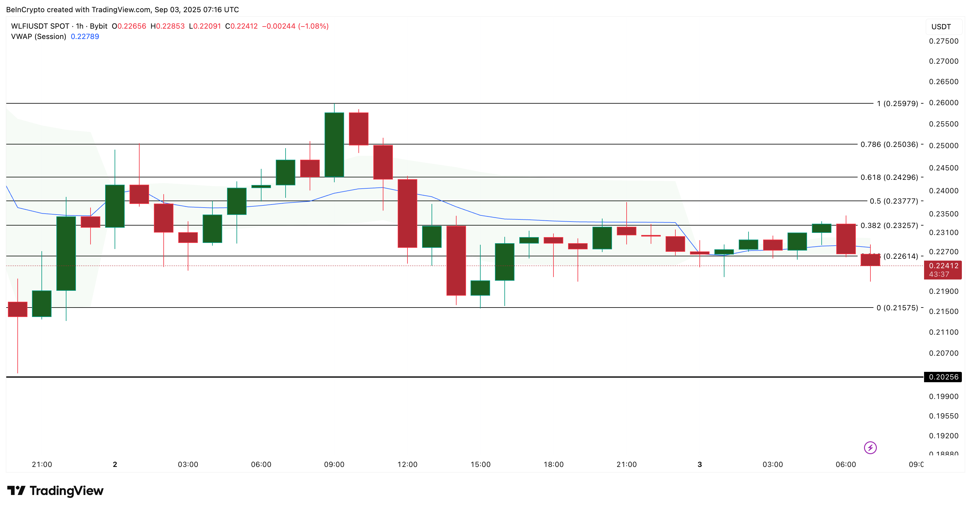 Pada grafik 1H, WLFI bertahan di atas support kuatnya di US$0,21 dan sedang berkonsolidasi di dekat US$0,22.
