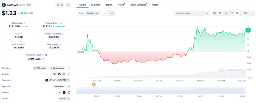 LAYER saat ini sudah tersedia di sejumlah crypto exchange. Saat publikasi artikel, harga per koin berkisar di angka US$1,33. Menurut data dari CoinMarketCap, rekor harga tertinggi LAYER tercatat pada 12 Februari 2025 di harga US$1,47.