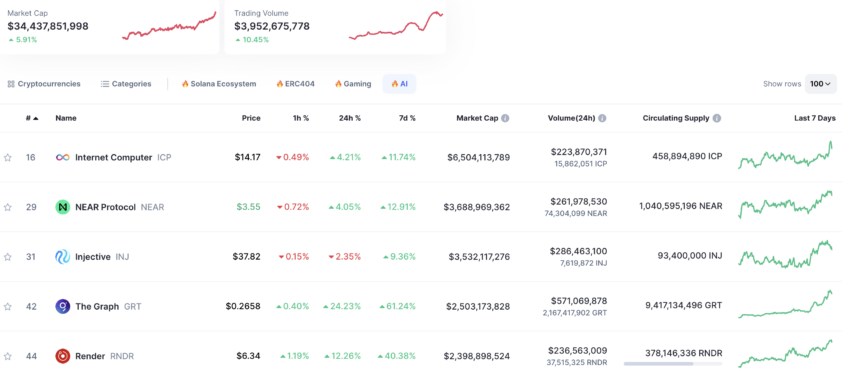 Terbukti, token-token yang terkait dengan AI atau setidaknya yang mengeklaim menggunakan teknologi AI, seperti WLD dari Worldcoin, telah mengalami kenaikan harga yang signifikan. Tidak hanya itu, sejumlah token bahkan sukses mencetak rekor harga tertinggi sepanjang masa (ATH).