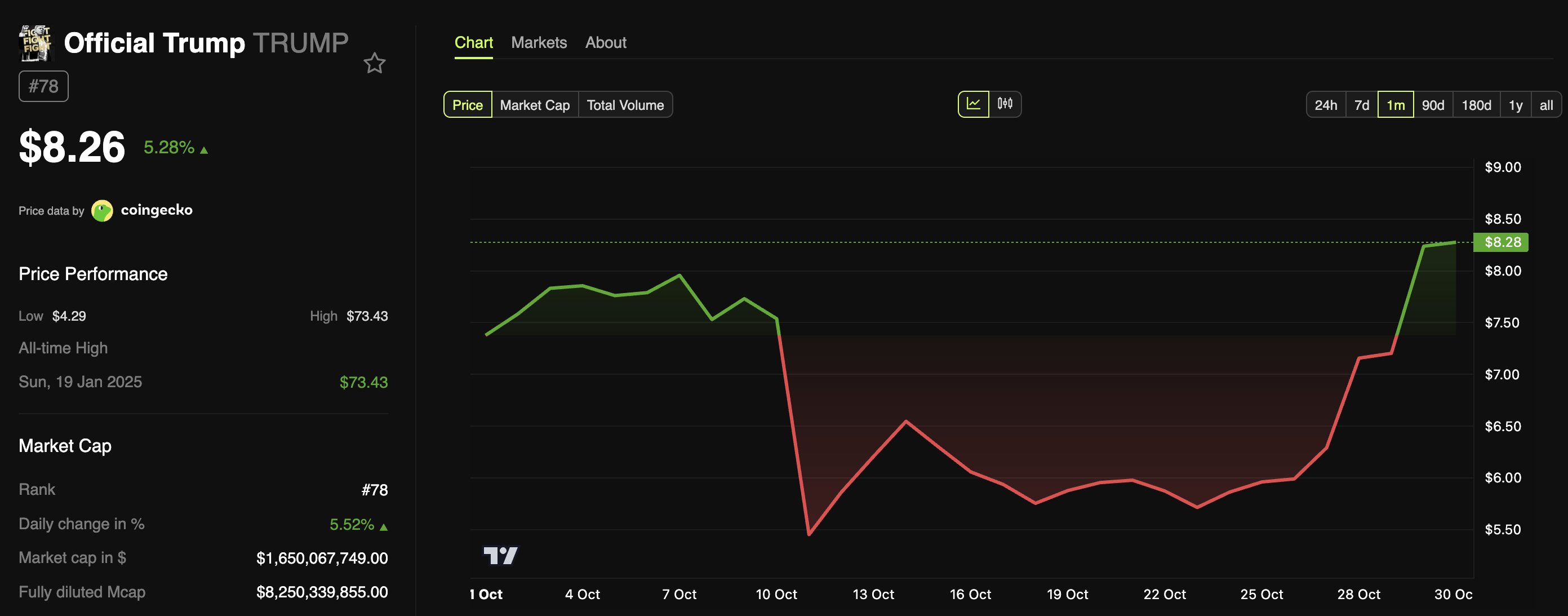 Hari ini, TRUMP sempat melonjak ke US$8,6, menandai level tertinggi hampir enam minggu. Pada waktu publikasi, harganya diperdagangkan di US$8,2, naik 5,28% dalam 24 jam terakhir.