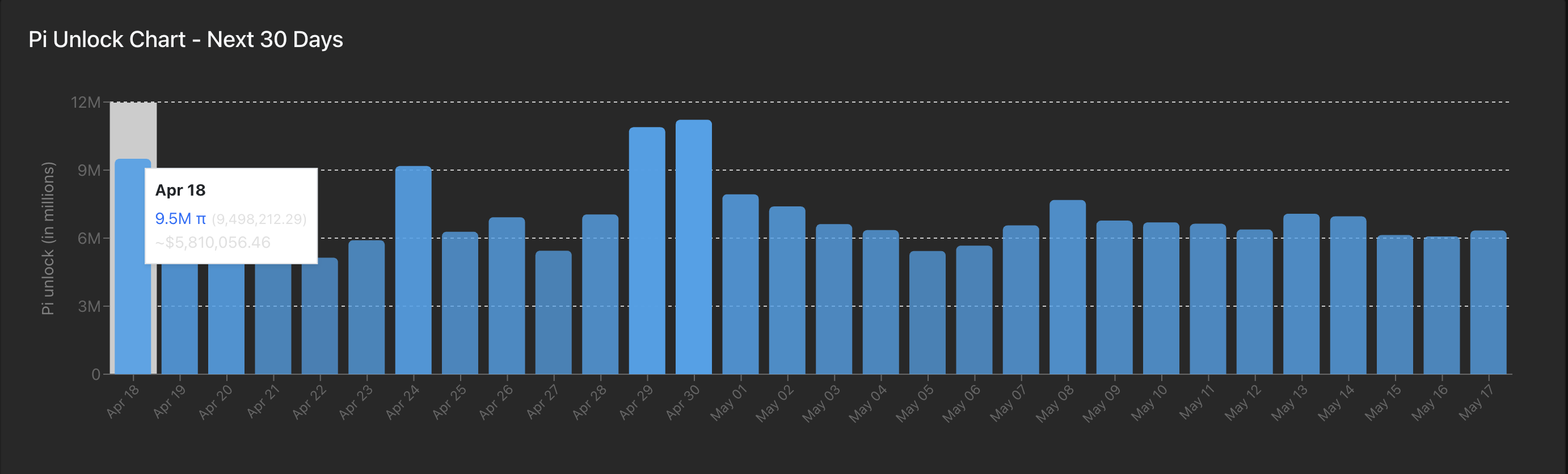 Menurut data PiScan, sebanyak 9,5 juta token (senilai US$5,76 juta) pada harga pasar saat ini akan dilepas ke sirkulasi hari ini (18/4). Ini merupakan bagian dari jadwal lebih besar yang akan menyaksikan lebih dari 1,56 miliar token PI mengalami token unlock selama 12 bulan ke depan.