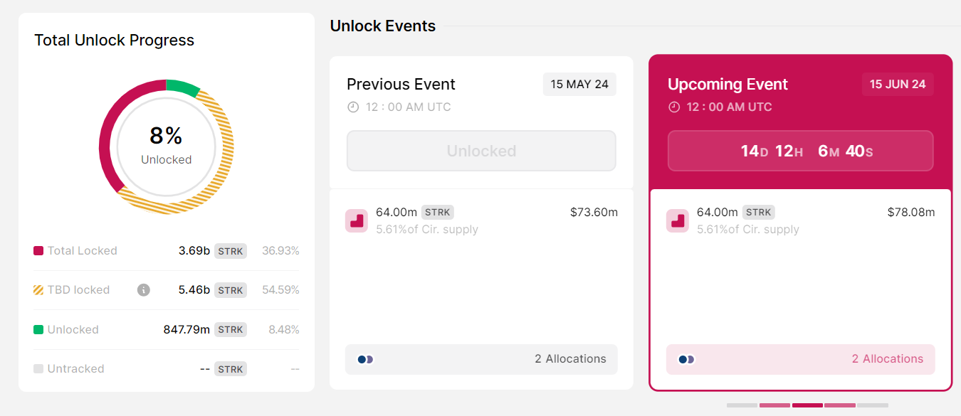 Selanjutnya, Starknet juga bersiap menyuntikkan total 64 juta token pada 15 Juni. Angkanya senilai US$78,08 juta. Token unlock ini akan mewakili 5,61% dari pasokan total STRK yang beredar. Distribusi unlock STRK terbagi sebagai berikut: