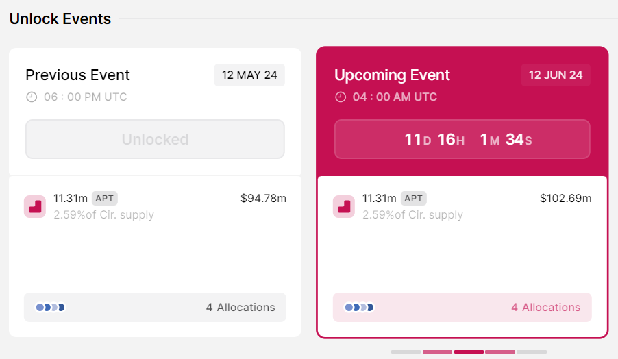 Proyek berikutnya dalam daftar token unlock Juni 2024 adalah Aptos (APT). Aptos bakal mendistribusikan 11,31 juta token pada 12 Juni mendatang. Unlock ini mewakili 2,59% dari pasokan yang beredar. Totalnya kira-kira US$102,69 juta. Gelaran unlock ini terbagi sebagai berikut: