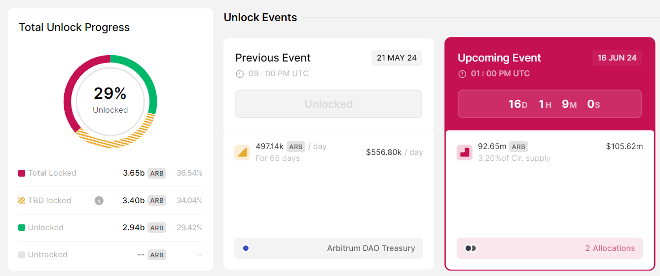 ARB, native token Ethereum layer-2 (L2) Arbitrum, siap menggelontorkan sebanyak 92,65 juta token senilai kira-kira US$105,62 juta pada 16 Juni. Unlock ini mewakili 3,2% dari pasokan yang beredar mereka. Rilis token ini terbagi sebagai berikut: