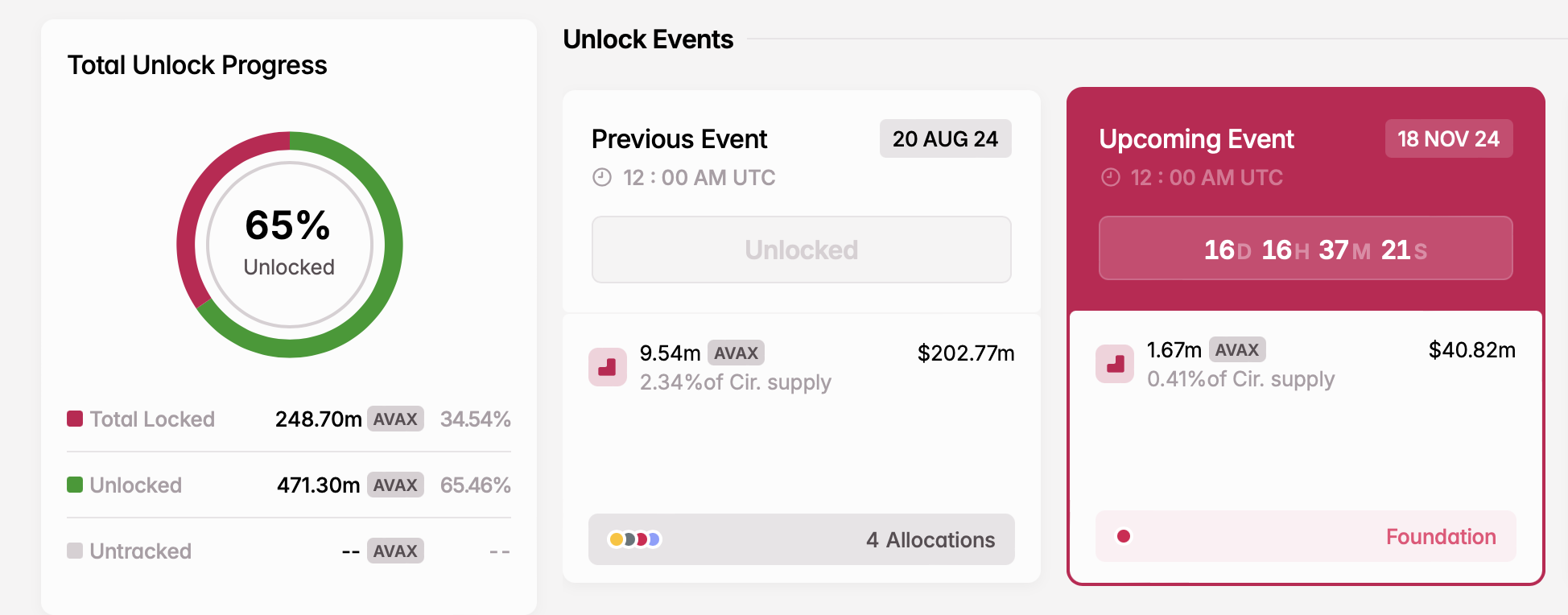 Pada 18 November, Avalanche akan melepaskan 1,67 juta token, bernilai sekitar US$40,82 juta. Token ini dialokasikan secara khusus untuk Avalanche Foundation, sebagai bagian dari jadwal pelepasan token proyek. Adapun gelaran unlock ini bertujuan untuk mendukung inisiatif-inisiatif foundation yang meliputi pengembangan ekosistem, kemitraan strategis, dan biaya operasional berkelanjutan.