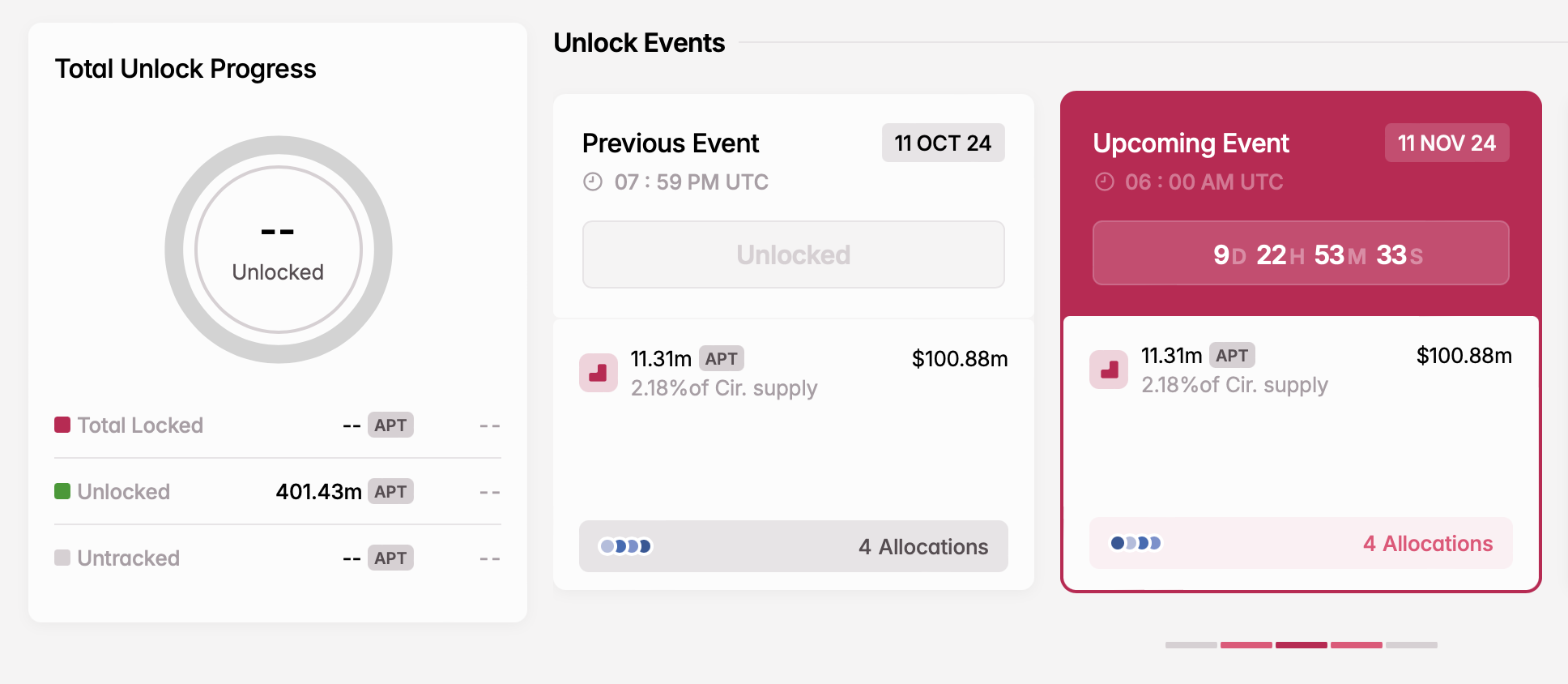 Unlock Aptos pada 11 November akan merilis 11,31 juta token APT ke pasar, setara dengan 2,18% dari total pasokan APT. Total nilainya sebesar US$100,88 juta.