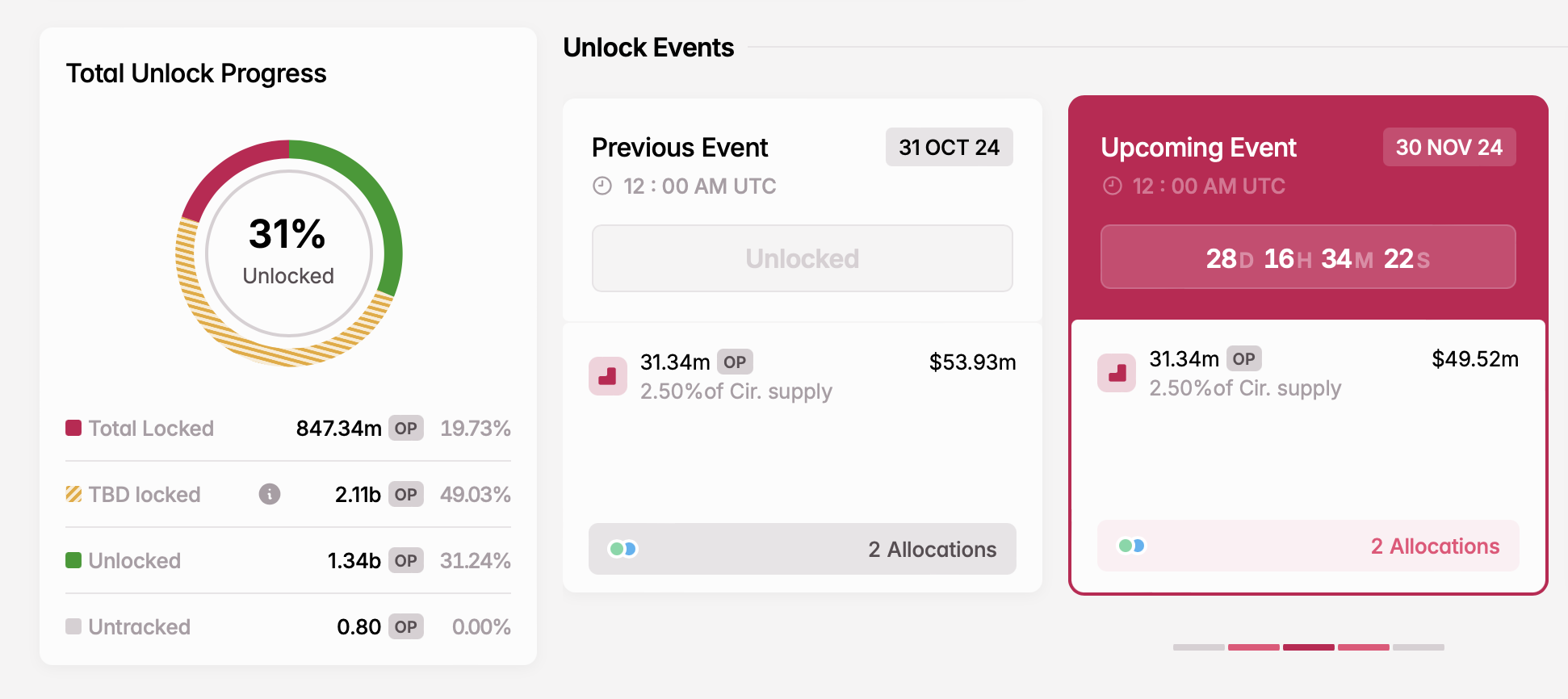 Pada 30 November, Optimism akan membebaskan 31,34 juta token OP, nilainya sekitar US$49,52 juta. Jumlah ini mencakup 2,50% dari pasokan yang beredar. Distribusi token ini adalah sebagai berikut: