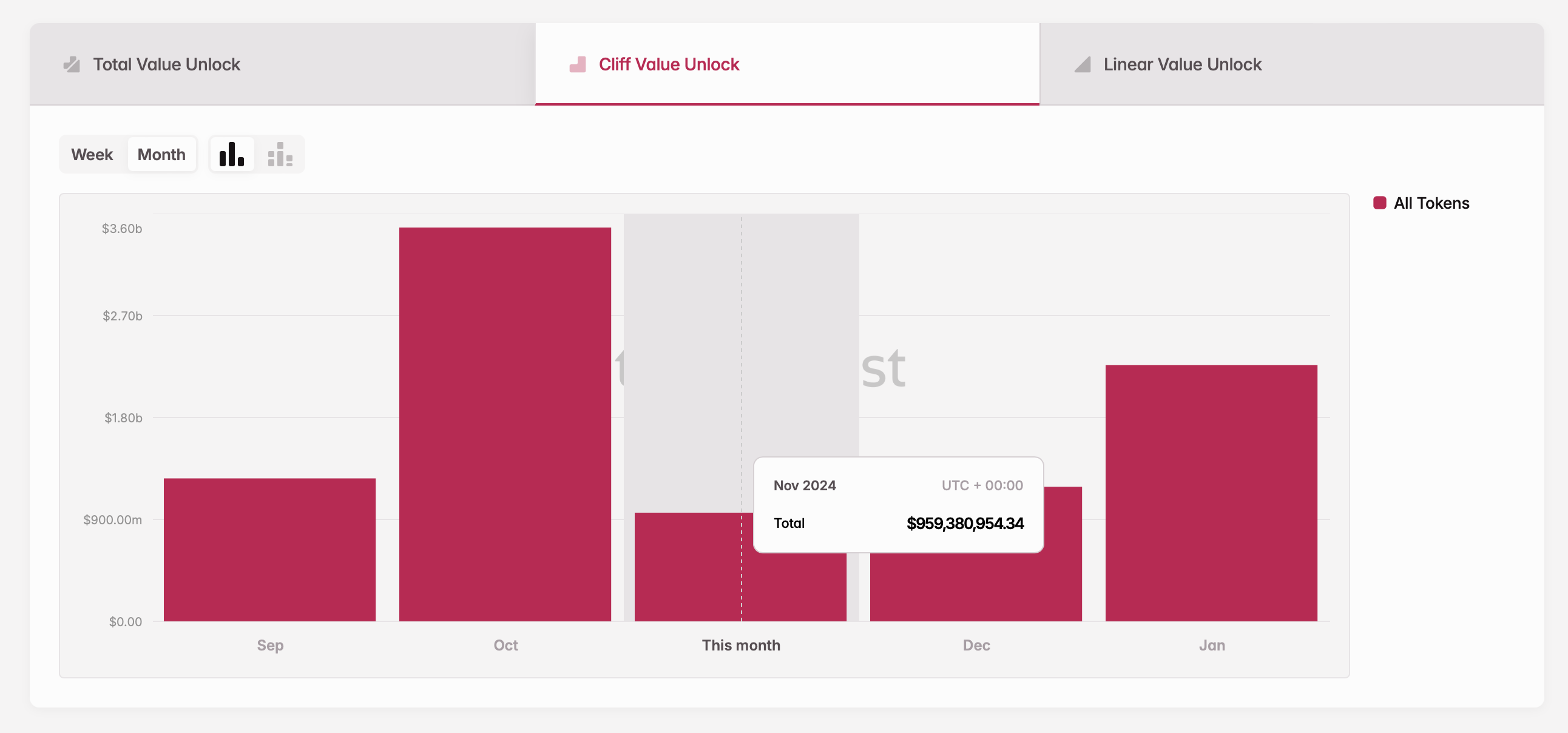 Menurut data dari Tokenomist (sebelumnya Token Unlocks), hampir US$1 miliar dari unlock bulan ini diklasifikasikan sebagai cliff unlock. Dalam event unlock token, cliff unlock merujuk pada pelepasan token yang dilakukan secara periodik, seperti mingguan, bulanan, atau tahunan, bukan harian.
