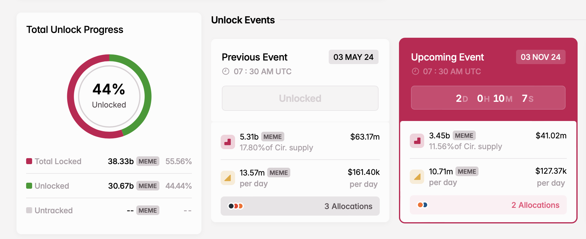 Pada 3 November, Memecoin akan melepas 3,45 miliar token MEME untuk didistribusikan kepada wallet yang memenuhi syarat untuk airdrop. Selain itu, unlock linear akan dimulai, menambah pasokan yang beredar sebesar 10,71 juta token setiap hari.