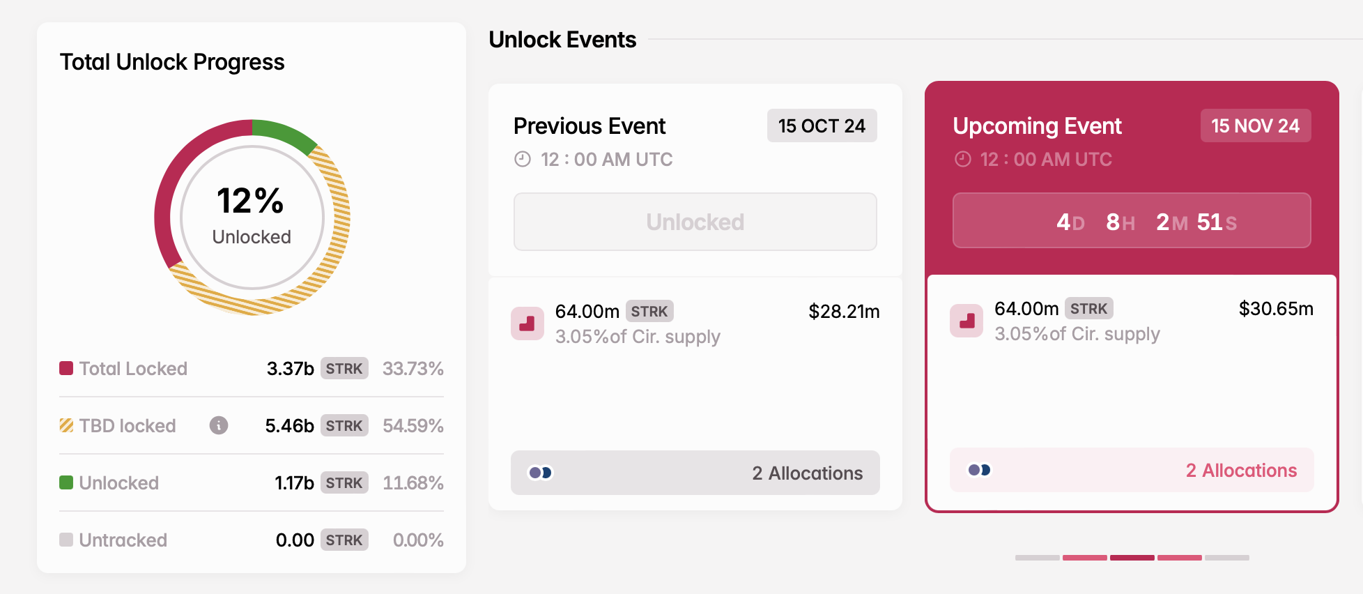 Pada tanggal 15 November mendatang, proyek ini akan melangsungkan token unlock untuk 64 juta token STRK. Alokasi token ini akan didistribusikan kepada investor dan kontributor awal.