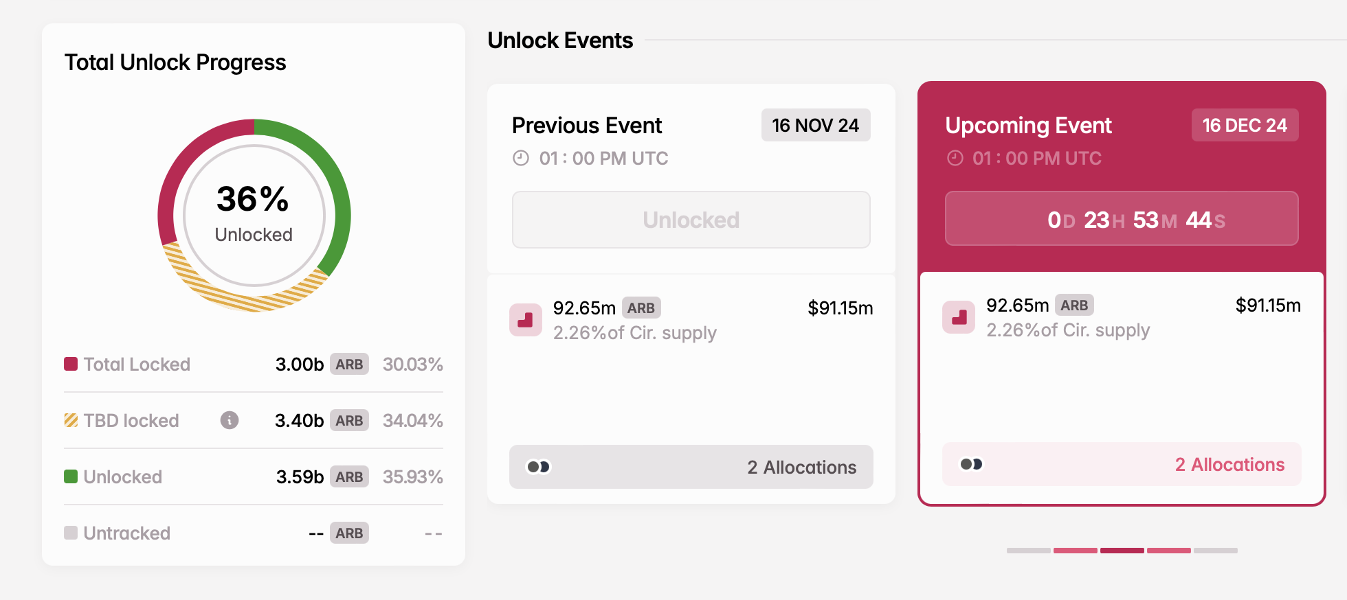 Pekan depan, Arbitrum akan melepaskan 92,65 juta token ARB dalam gelaran unlock. Unlock kali ini bernilai sekitar US$91 juta, dengan alokasi kepada tim, penasihat, dan investor.