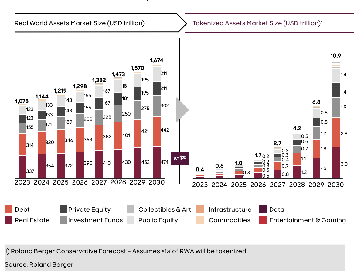 Nilai aset yang di-tokenisasi akan mencapai setidaknya US$10,9 triliun pada tahun 2030. Sumber: Roland Berger.