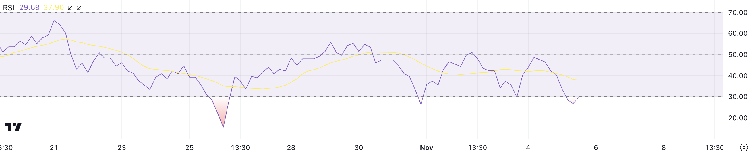 RSI mengukur kecepatan dan perubahan pergerakan harga. Level di bawah 30 menunjukkan kondisi oversold, dan level di atas 70 menunjukkan kondisi overbought. RSI di bawah 30 dapat menandakan undervaluation, yang sering kali mengindikasikan potensi terjadinya rebound harga.