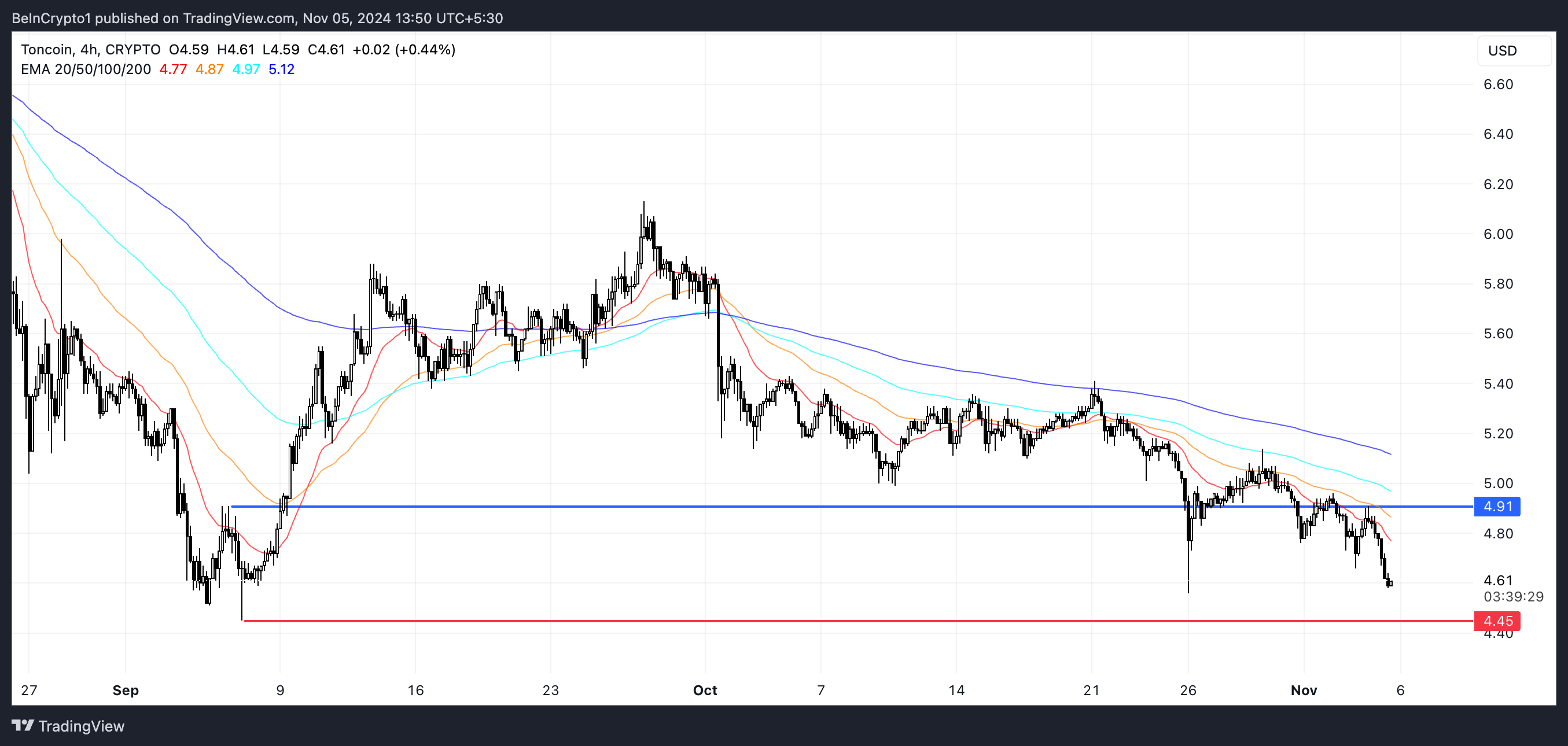 SponsoredPenyelarasan ini menunjukkan bahwa penjual saat ini mengendalikan, dan tren turun mungkin berlanjut. Jika pola ini terus berlanjut, harga TON kemungkinan akan menguji support di sekitar level US$4,45, di mana bisa mencari stabilisasi.