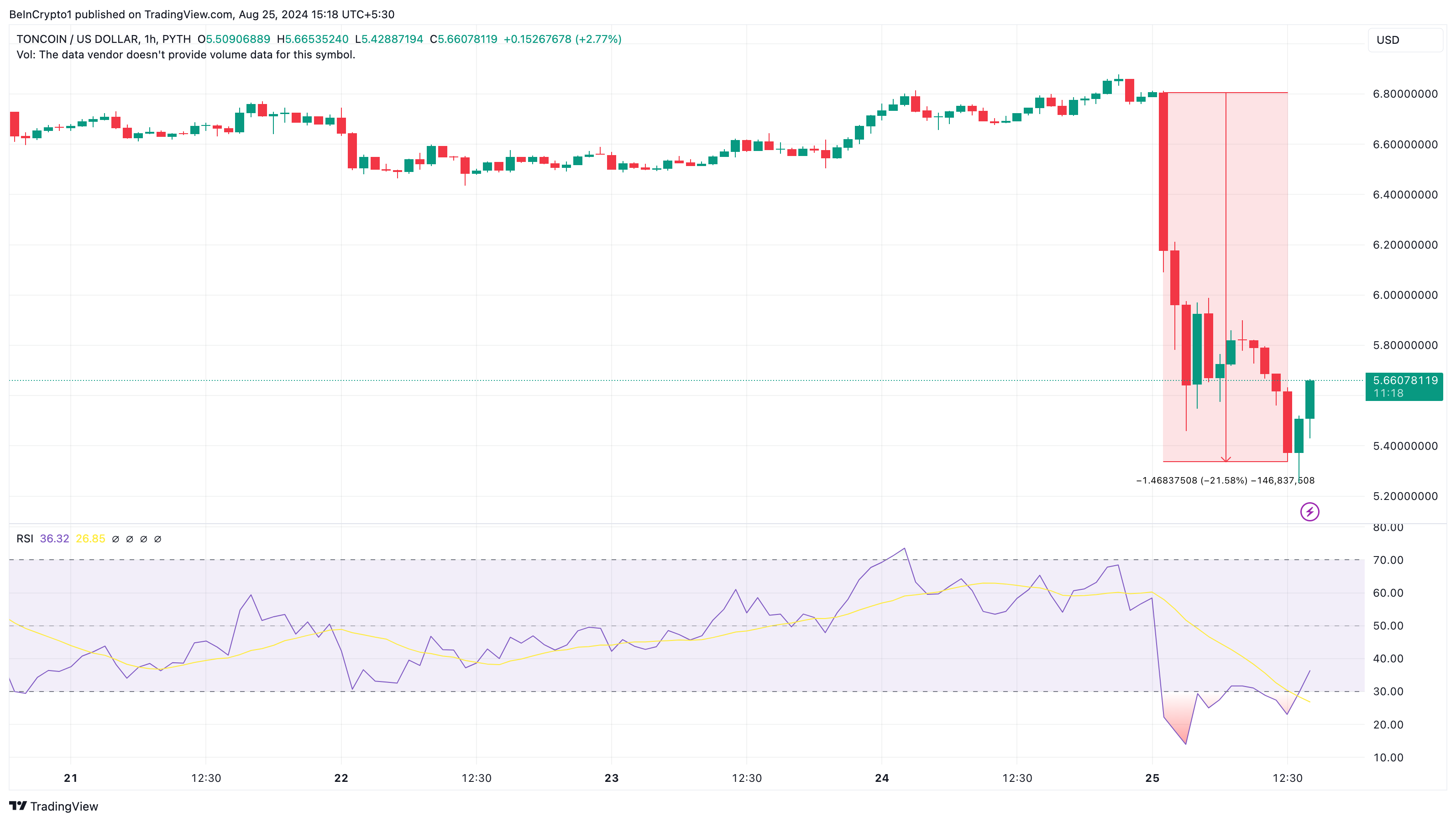Pada grafik 1 jam, penangkapan CEO Telegram Pavel Durov sukses memantik penurunan tajam harga Toncoin dari US$6,80 menjadi US$5,33. Aksi turun ini pada gilirannya turut menyeret indikator Relative Strength Index (RSI) ke zona oversold.