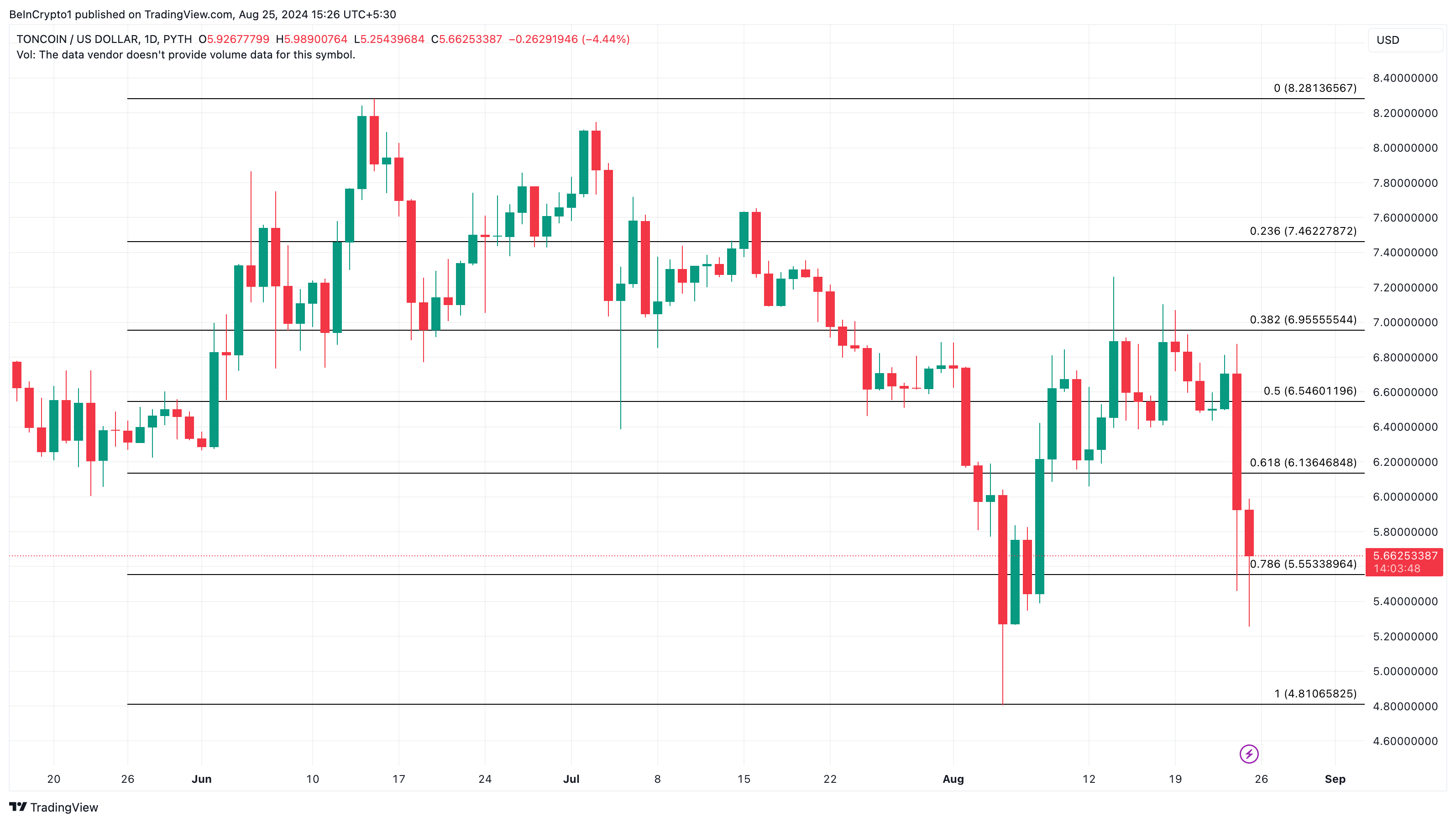 Hal ini juga terlihat dari harga TON. Dalam beberapa jam terakhir, harga altcoin ini sudah terapresiasi sebesar 5% serta menguji ulang/retest US$5,66. Deret Fibonacci Retracement pada grafik harian juga memberikan wawasan terkait pergerakan TON berikutnya.
