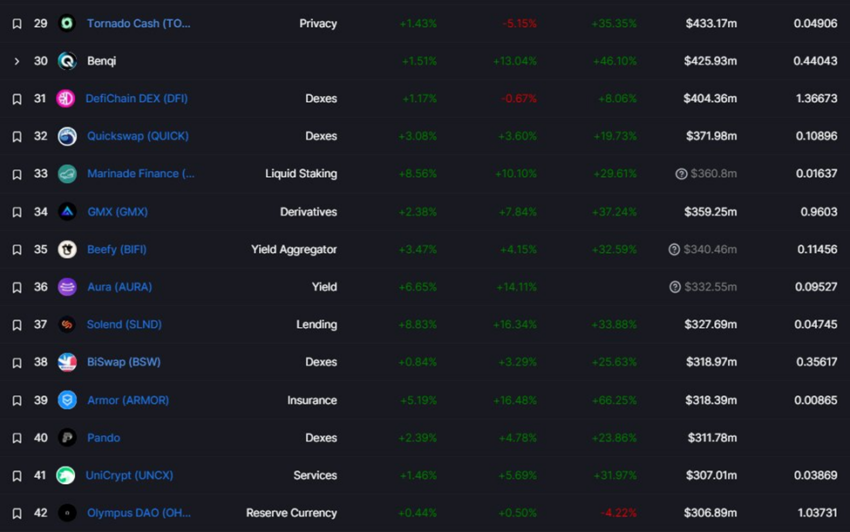 Lalu, setelah TVL-nya meroket sebesar US$148,24 juta, Tornado Cash akhirnya berhasil memiliki pangsa terbesar berdasarkan TVL jika kita bandingkan dengan TVL Quickswap, DefiChain DEX, Benqi, Solend, BiSwap, dan Marinade Finance.