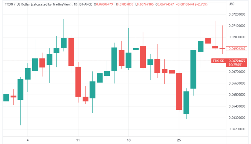 TRX mulai diperdagangkan pada tanggal 1 Juli di harga US$0,06479. Kemudian, sukses mencapai puncaknya untuk bulan yang sama di level US$0,07166. TRX menguji level terendahnya untuk bulan Juli di titik US$0,06256, serta mengakhiri bulan yang sama di level harga US$0,06894. Secara keseluruhan, pergerakan ini mencerminkan peningkatan harga sebesar 6% pada harga pembukaan dan penutupan TRX di bulan Juli.